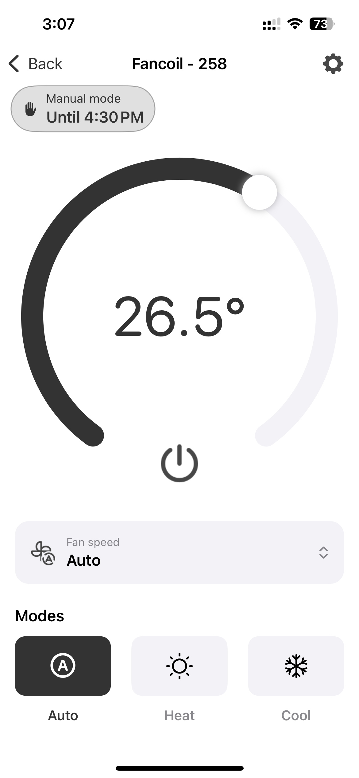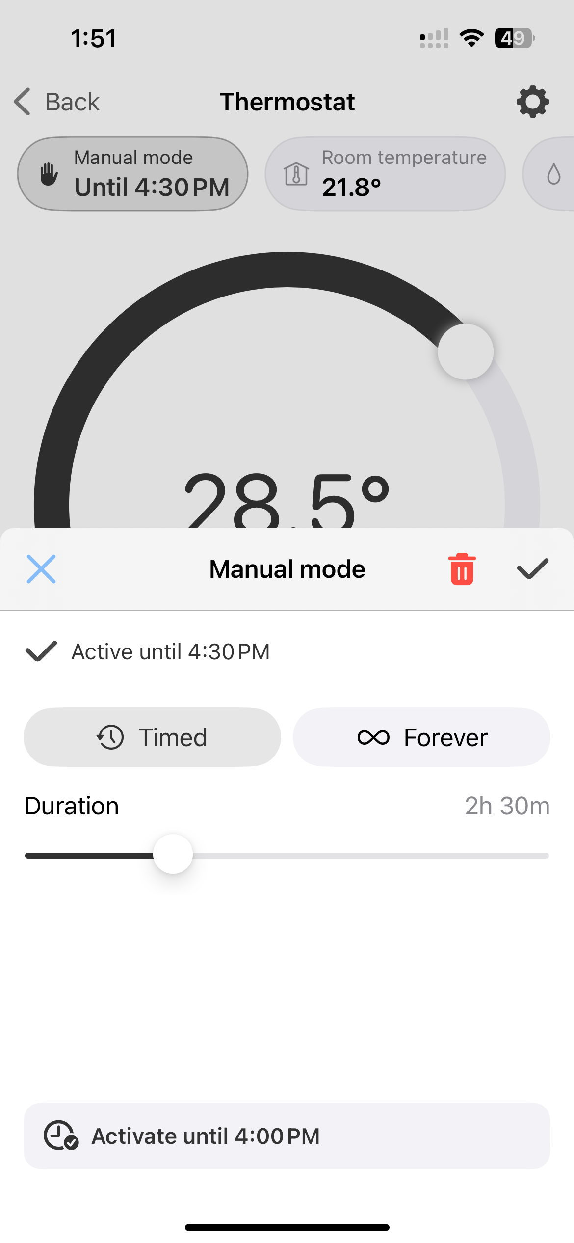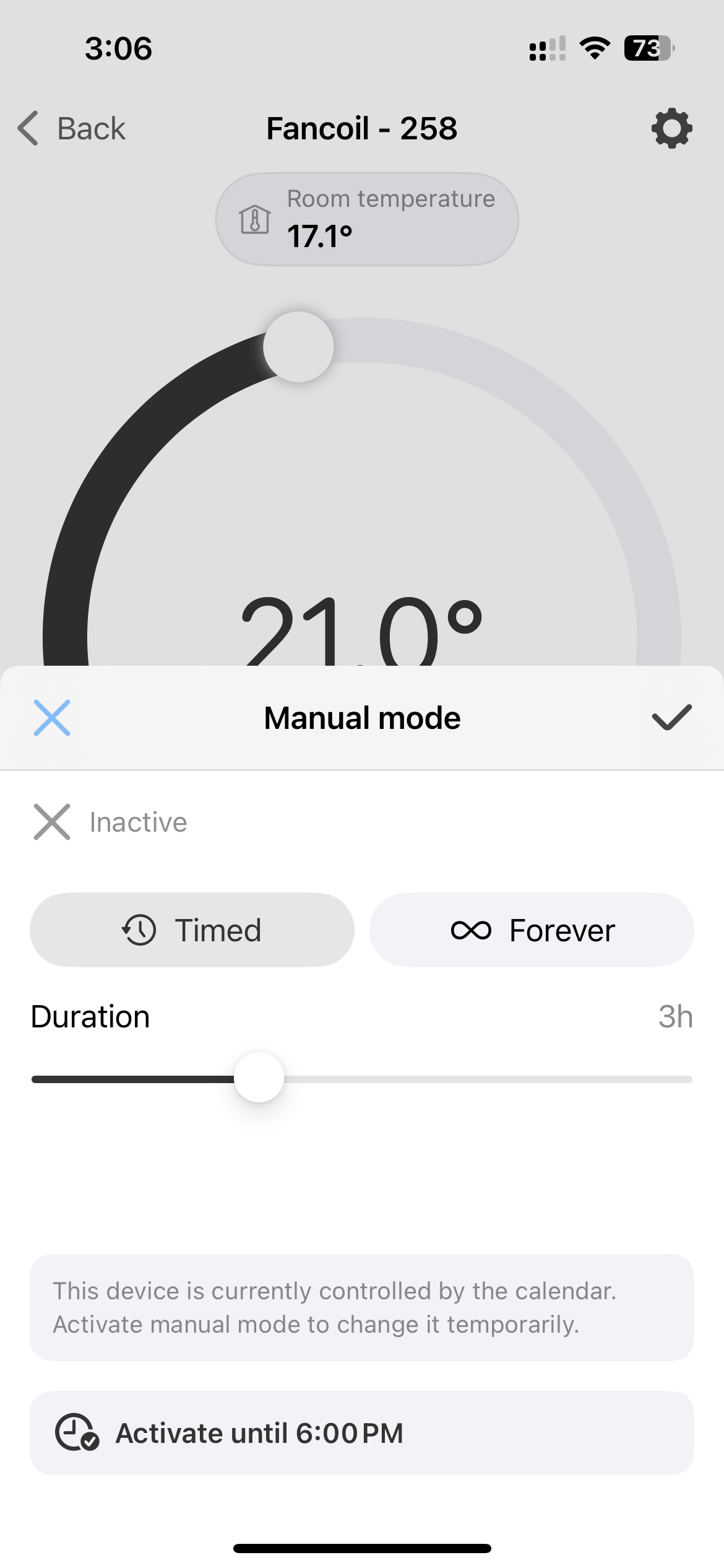 Once in manual mode, the control view shows a badge indicating when the override will expire.