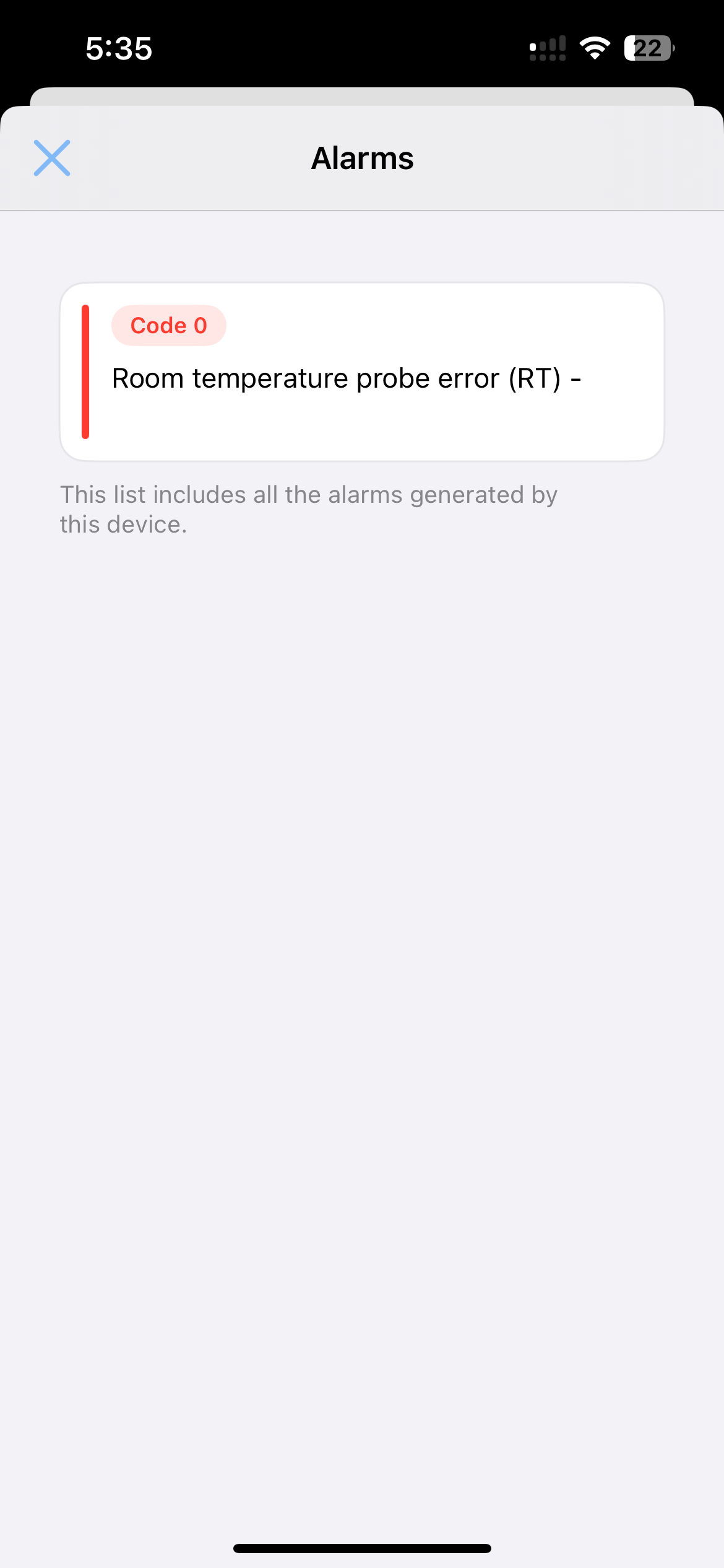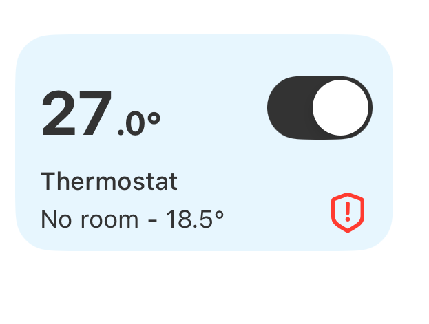 When a device encounters an issue it will report an alert. Devices with active alerts are clearly marked on the home screen. Tap the device to open its control view, then tap the badge in the top-left corner to see the list of active alerts.