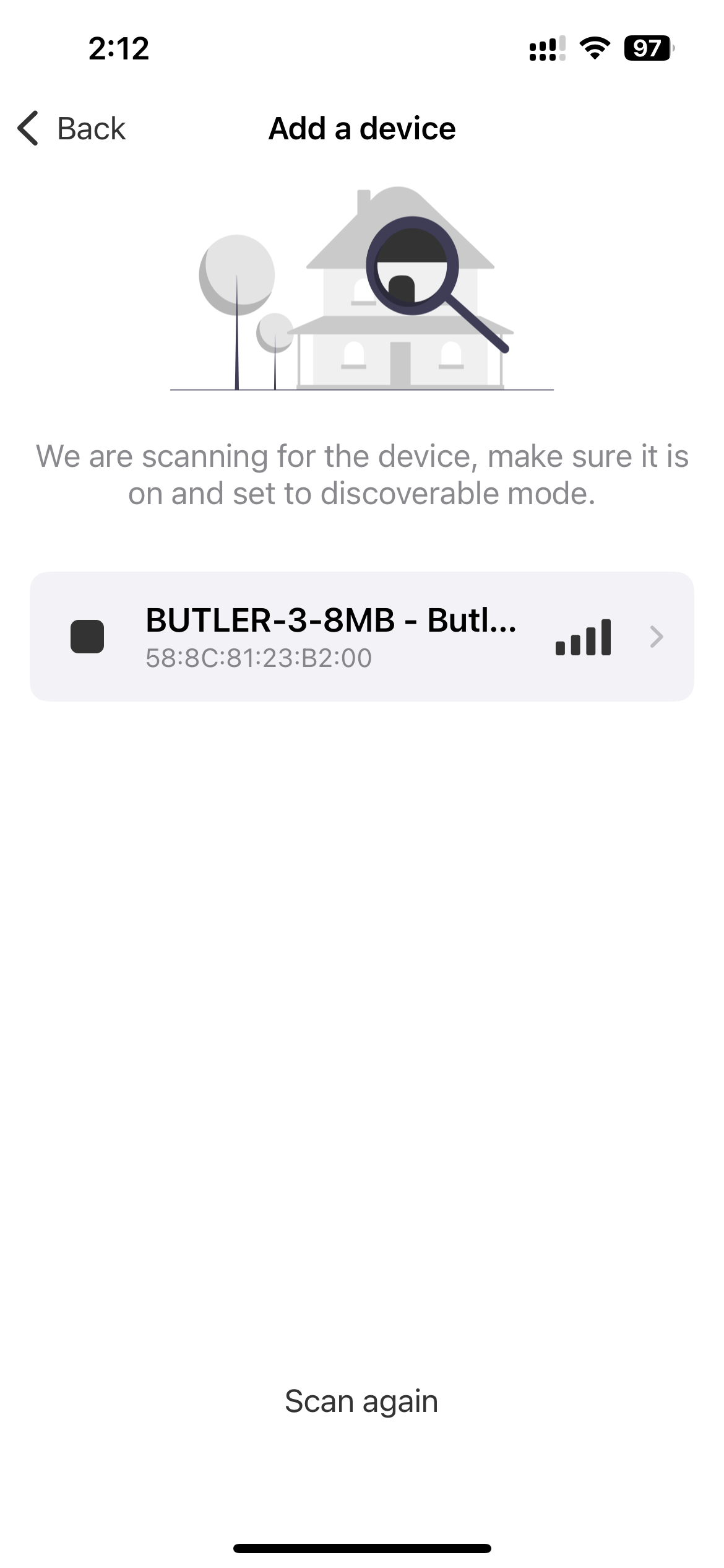 - Your device will appear in the list (e.g., “BUTLER-3-8MB”) with its MAC address.