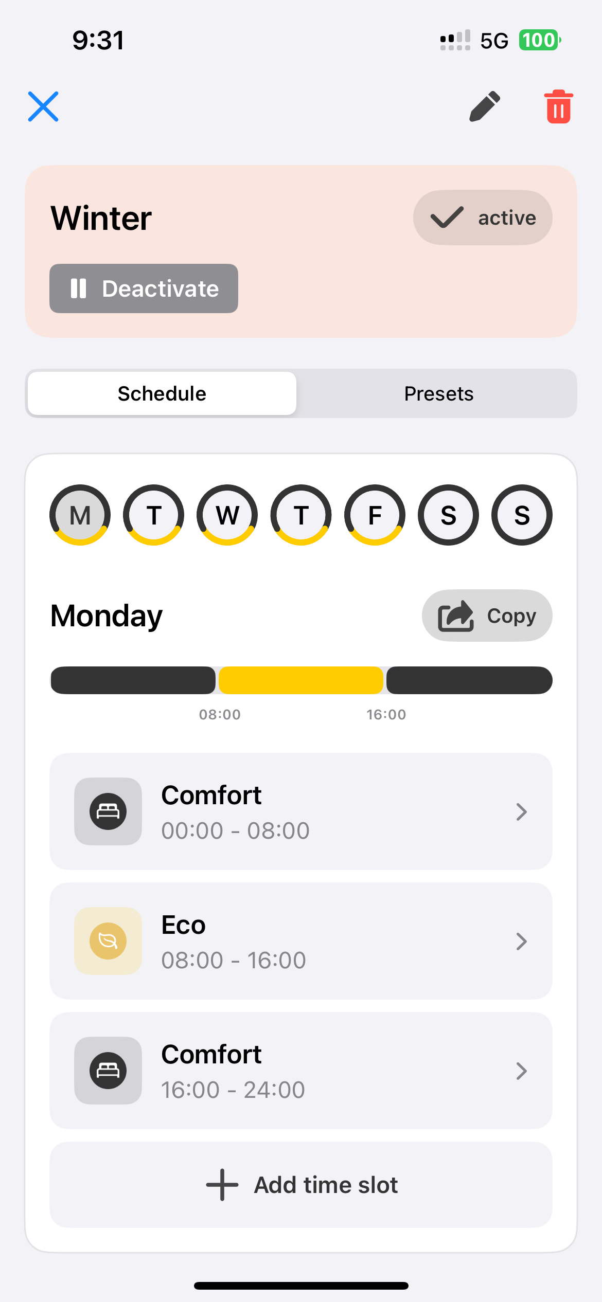 Presets define a set of temperature and mode settings that are applied to your devices by a calendar at scheduled times. Each calendar comes with a set of default presets that you can customize.