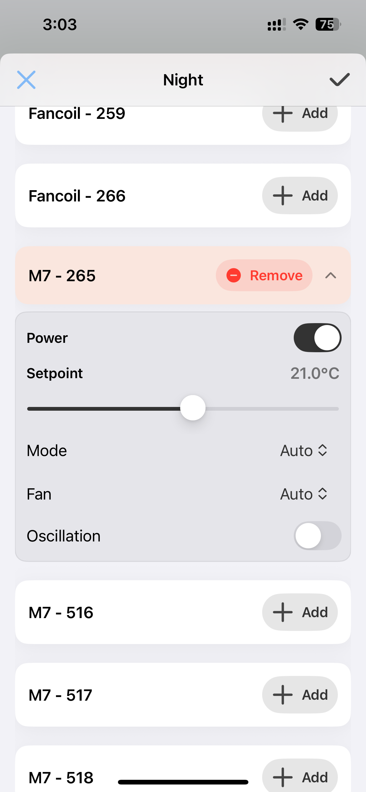 Configure the target temperature, fan speed, and operating mode for each fancoil.